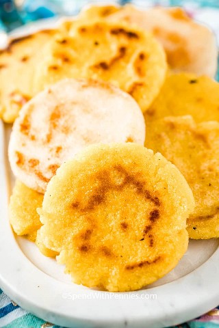 arepas Son un delicioso pastel de maíz frito a la parrilla popular en América Latina. Son como un cruce entre una tortilla y un panecillo inglés y son deliciosos con carne rellena o cubiertos con carne desmenuzada, queso y verduras.