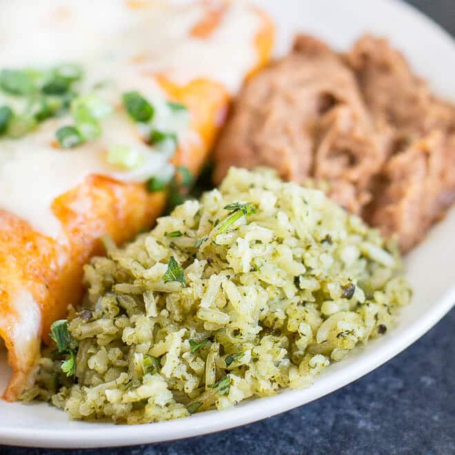 El arroz verde se parece mucho a esto, solo que en lugar de tomate, está hecho con chile poblano y cilantro. Eso significa mucho sabor y una gran apariencia con motas verdes.