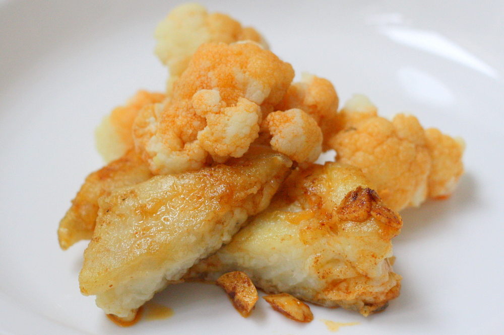- Mientras la coliflor está hirviendo, unte el bacalao con la harina y dore cada pieza en aproximadamente ½ pulgada de aceite, asegurándose de que cada lado esté dorado pero no demasiado cocido.