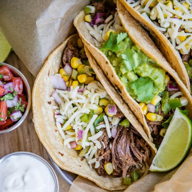 - Transfiera a una olla de cocción lenta y cubra con la marinada. Agregue agua y hojas de laurel y cubra. Cocine en ALTO durante 4-6 horas o bajo durante 8-10 horas. La carne debe desmoronarse fácilmente.