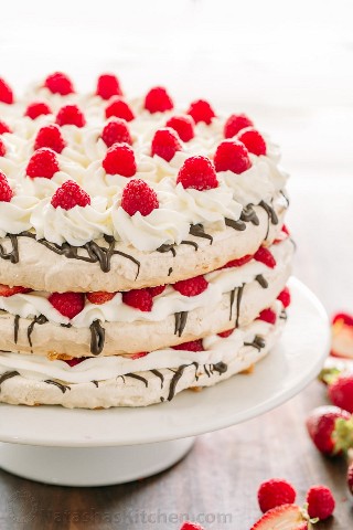 Un pastel italiano clásico: capas de merengue crujiente, mucha fruta fresca, crema batida ligeramente endulzada y, por supuesto, ¡chocolate! ¡Asegúrate de servir el almíbar de frutas, que va encima!