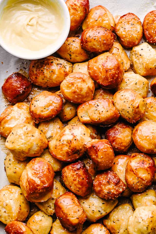 Los pretzels siempre han sido uno de mis bocadillos favoritos. Recuerdo que mis amigos y yo íbamos al centro comercial solo para comprar un pretzel suave, pero siempre eran tan grandes que quería algo más pequeño, así que le di un mordisco y lo cubrí con mi relleno favorito: sal marina y orégano. . Y ahora, cada vez que vienen mis amigos, piden estos bocados de pretzel.