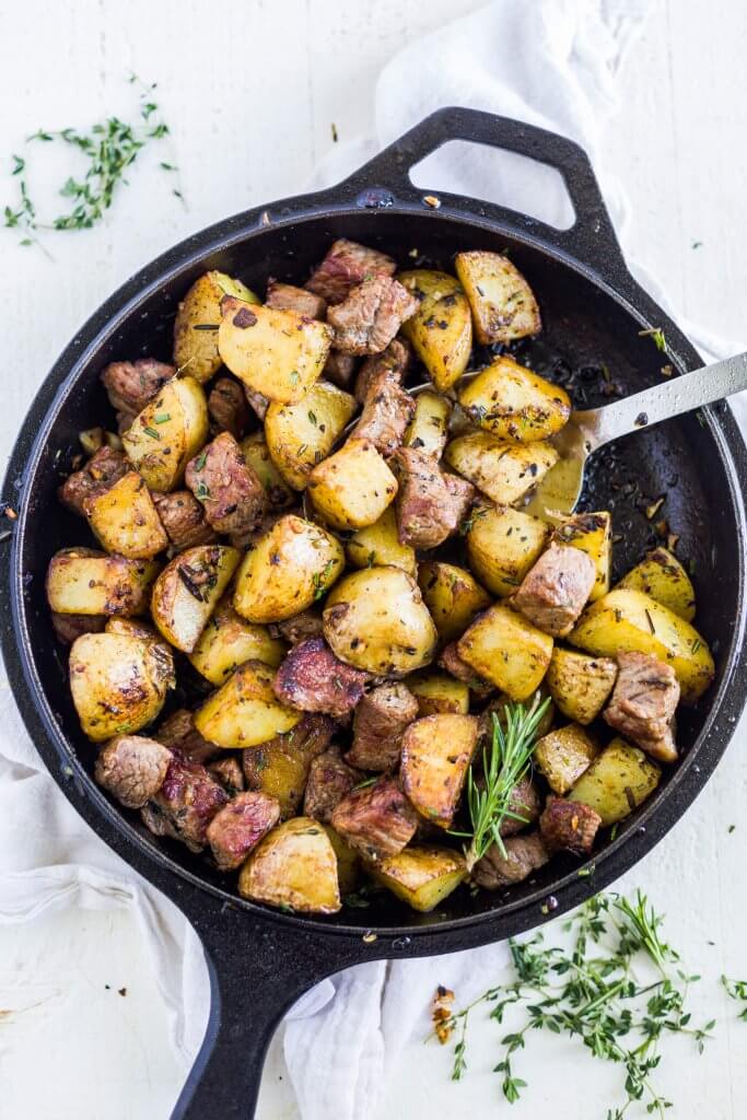 ¡Prepara estos bocados de filete de patata en menos de 20 minutos! Es una comida sin gluten y sin lácteos llena de ajo y hierbas frescas. Las cáscaras de papa crujientes y el bistec tierno hacen de esta comida una receta para una olla durante la noche entre semana.