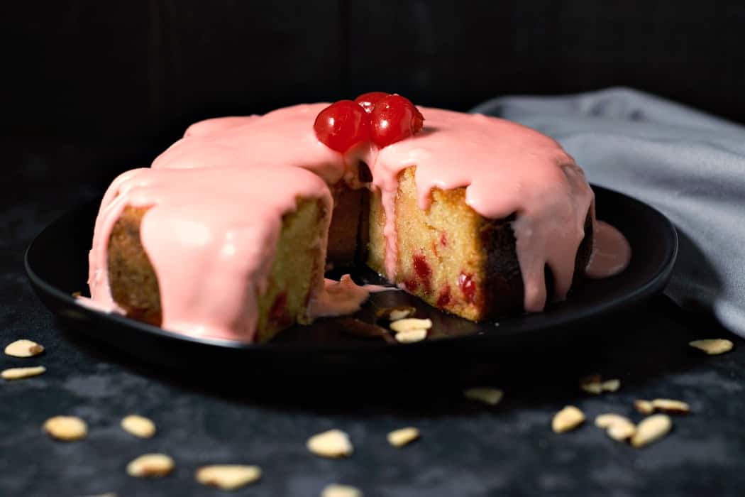Glazed Cherry Almond Cake es un delicioso pastel con cerezas al marrasquino en cada bocado y un bonito glaseado de cereza rosa y almendras en la parte superior.
