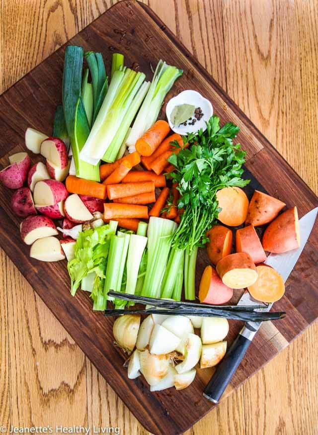 Recomiendo usar verduras orgánicas para este caldo, especialmente si está cocinando para alguien con un sistema inmunológico comprometido. Los vegetales orgánicos aseguran los ingredientes más limpios y libres de químicos.