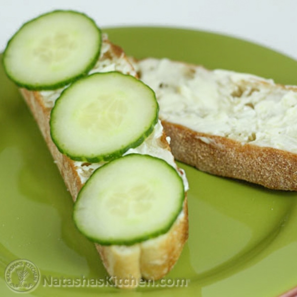 4. Extienda la cantidad deseada sobre cada rebanada de baguette y cubra con un pepino en rodajas (opcional).