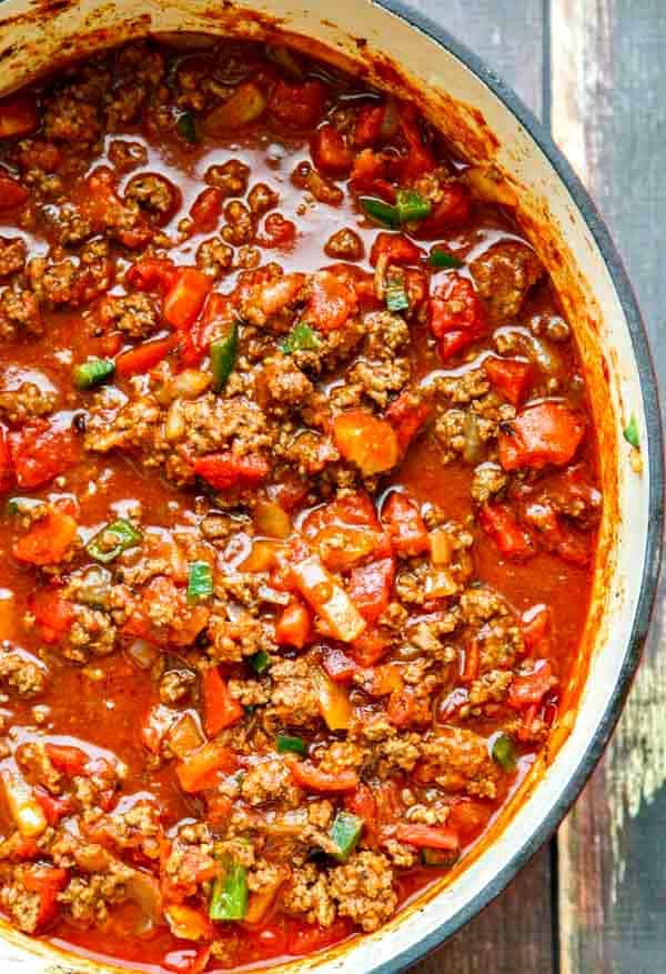 ¡Esta sencilla receta de chili sin frijoles tiene mucha carne y aún más sabor!