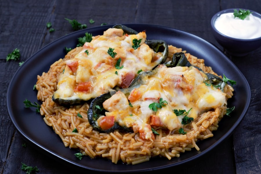 ¡Los pimientos rellenos de pollo y queso son fáciles y deliciosos! El pollo, el ajo y el tomate se rellenan con chiles poblanos ligeramente especiados y se cubren con queso derretido pegajoso.
