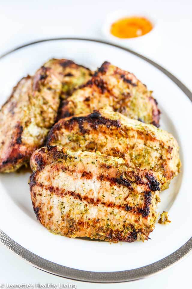 Puse todos los ingredientes de la marinada en el procesador de alimentos y dejé marinar las chuletas de cerdo durante la noche. Probé esta receta con chuletas de cerdo deshuesadas y quedaron mucho más secas, así que recomiendo usar chuletas de cerdo con hueso.