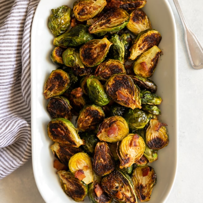 Ya sea fresco en el tallo que se vende en la bolsa, estos pequeños con forma de repollo tienen un sabor grande y audaz que requiere un tratamiento grande y audaz. El asado a alta temperatura resalta su dulzura natural y tocino, ¿quién puede resistirse a cualquier cosa horneada con tocino?