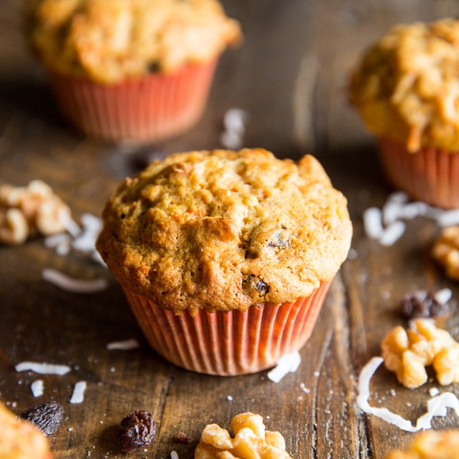 Los ingredientes incluyen manzanas, zanahorias, piña, coco, pasas y nueces de California. Eso significa que estos cupcakes están repletos de fibra, nutrientes, minerales y grasas buenas.