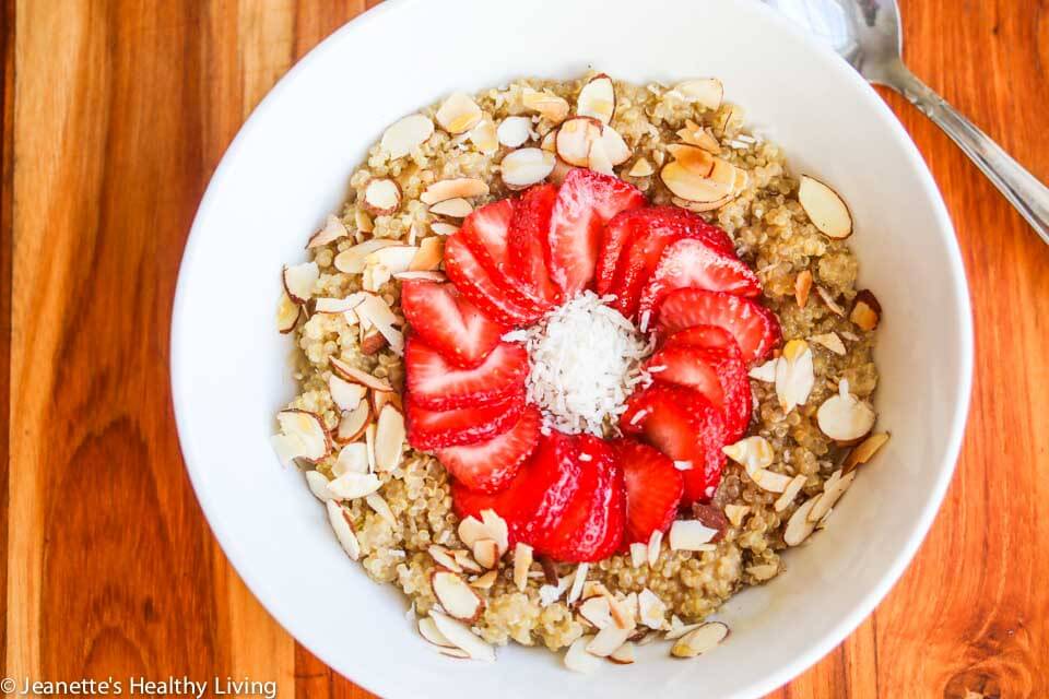 Este desayuno lo hice con quinoa con fresas y almendras del recetario Natural Pregnancy, un nutritivo y delicioso desayuno elaborado con cereales integrales. Es rica en proteínas, fibra, vitaminas y minerales. Ya sea que estés embarazada o no, este es un desayuno familiar que te mantendrá con energía toda la mañana.