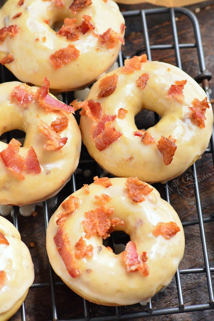 Rosquillas caseras fáciles hechas con tocino y jarabe de arce por dentro y cubiertas con una cobertura de arce dulce y tocino crujiente.
