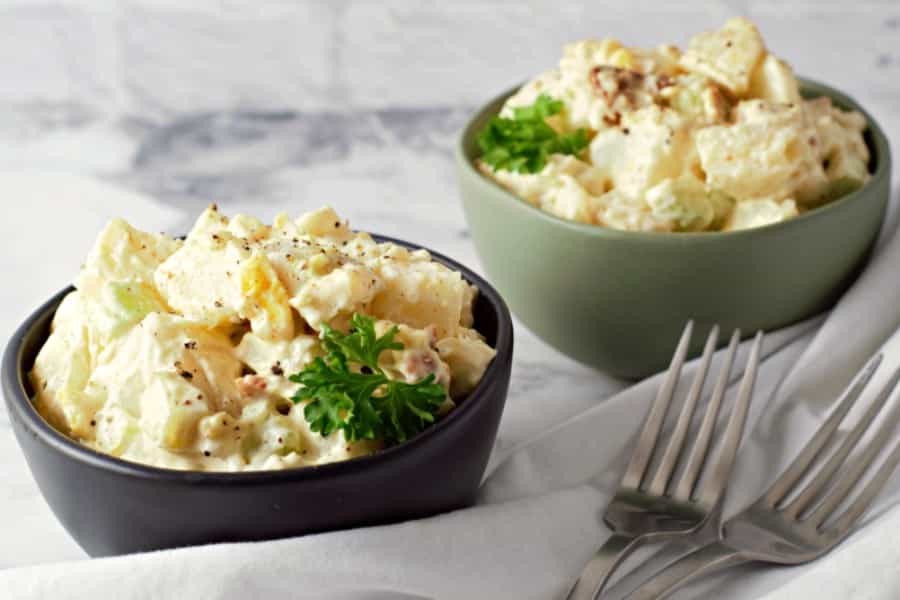 Esta deliciosa y cremosa ensalada de papas está repleta de tocino crujiente, papas tiernas, huevo cocido cortado en cubitos, pepino encurtido, cebolla y apio cubierto con un aderezo simple de mayonesa, sal y pimienta sazonada.