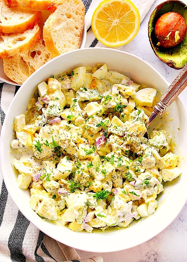 Esta ensalada de huevo con aguacate es mi nuevo giro favorito en el plato clásico. Agregué aguacate y cebolla roja crujiente y aligeré la salsa reemplazando la mayonesa con crema agria natural y jugo de limón. Rocíe con eneldo, sal, pimienta y perejil picado y tendrá una deliciosa ensalada de huevo para sándwiches, wraps o con rebanadas de baguette.
