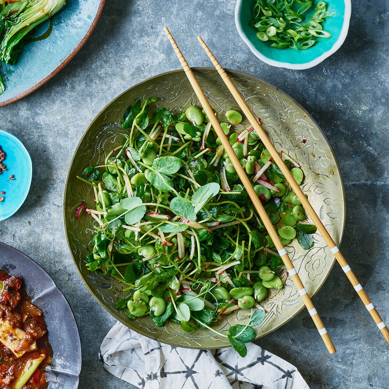 Mezcla los rábanos con el 1/4 de cucharadita restante de sal y deja reposar durante 3 minutos. Exprima la mayor parte de la humedad de los rábanos y agréguelos a la salsa. Agregue los brotes, el cebollino y los frijoles; Mezcle suavemente para cubrir.