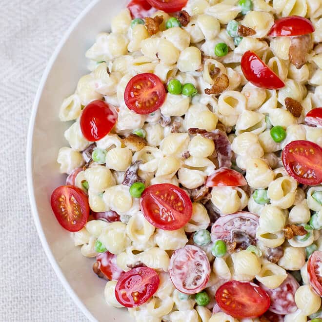 ¡No busques más, hombre! Esta ensalada de pasta BLT es deliciosa y simple: un sándwich clásico convertido en una guarnición cremosa. BLT + Ensalada de fideos = Ganador.