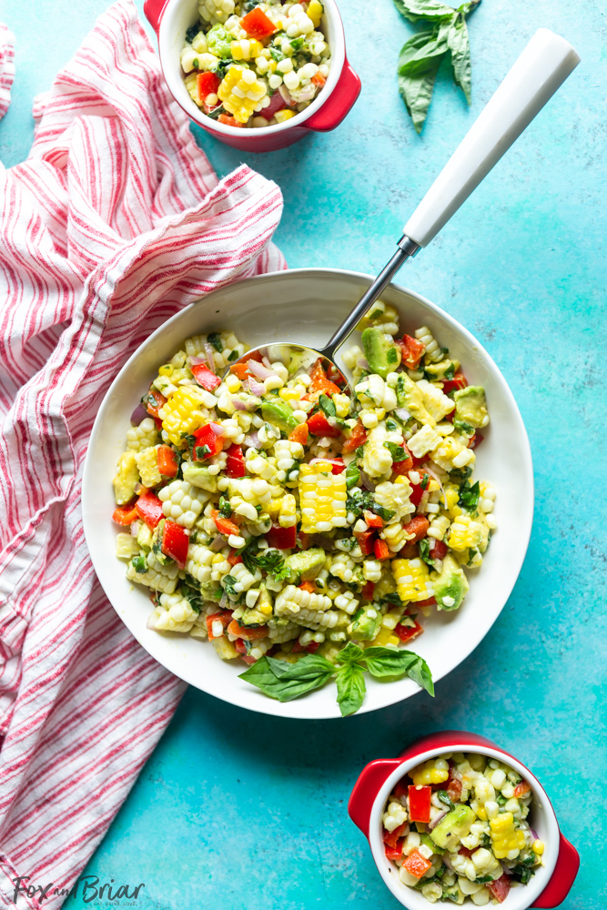 Esta ensalada de maíz es el epítome de los productos de finales de verano. Maíz fresco en la mazorca, pimientos y mucha albahaca fresca. Luego un poco de cebollín para darle más sabor y aguacate para darle más cremosidad. Un simple aderezo de limón y aceite de oliva hace brillar los sabores. El limón también evita que los aguacates se pongan marrones, ¡así que puedes hacerlo con anticipación!