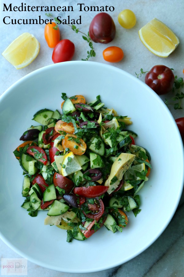 Esta receta de ensalada de tomate y pepino es una excelente manera de aprovechar la generosidad del final del verano. Con el final del verano, abundan los tomates y pepinos y esta ensalada celebra todos los sabores de la temporada. Con tomates maduros, pepino inglés sin semillas, aceitunas kalamata, alcachofas marinadas y un toque de limón, esta ensalada es el acompañamiento perfecto para el verano o un almuerzo ligero.