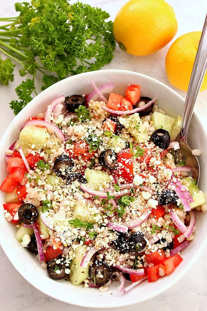 Receta de ensalada griega de cebada – Ensalada fresca y sabrosa con sabores mediterráneos y cebada. Ideal para preparar alimentos.