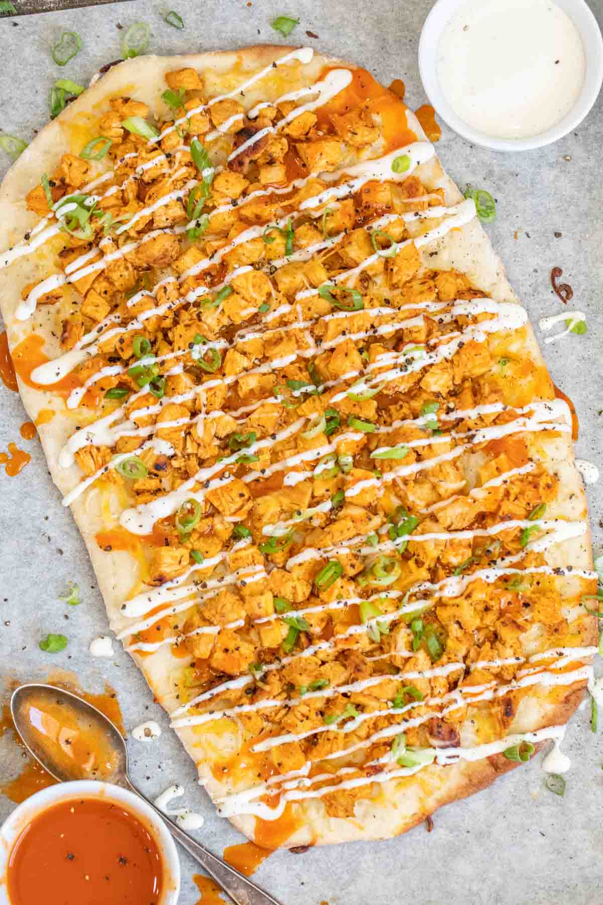 ¡Prepara la focaccia de pollo al búfalo más deliciosa! Una focaccia casera fina y crujiente cubierta con un suculento pollo al búfalo, queso rallado y cebolla verde, absolutamente deliciosa.