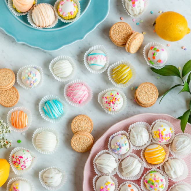 Esta receta de bola de galleta de limón está inspirada en las Oreos de temporada con sabor a limón. Se hacen como las tradicionales bolas de galletas Oreo, pero tienen un sabor más ligero y brillante, como el pastel de queso con limón. ¡Estas bolas solo requieren 3 ingredientes, pero las decoraciones opcionales agregarán un toque de color a tu mesa festiva! Cocina: Americana Tiempo de cocción: 20 minutos Tiempo de congelación 10 minutos Tiempo total: 30 minutos Porciones: 36 bolas de galleta Calorías: 113kcal