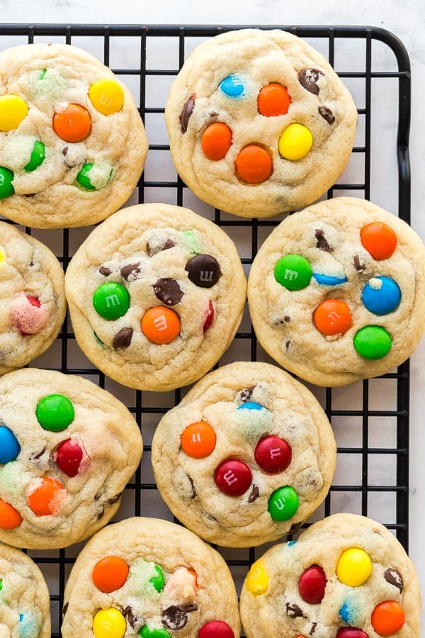 Son suaves en el centro y masticables alrededor de los bordes, con una buena cantidad de chispas de chocolate y M&M en la masa y un toque de M&M presionado en la parte superior de las galletas cuando salen del horno.