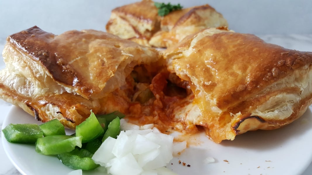 Los calzones de hojaldre de pizza tienen mozzarella y pimientos rellenos con hojaldre mantecoso y horneados en el horno hasta que estén pegajosos y se derritan en una corteza dorada y crujiente. Agregue todos sus ingredientes de pizza favoritos.