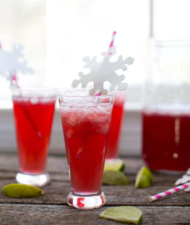 Las margaritas son mis favoritas de todos los tiempos, sin importar la temporada. Compartí la receta de la margarita de mango y mora cuando hacía calor, pero para esta época del año no se veía mejor que la de arándano. El cóctel es increíblemente delicioso (¡gracias, licor de naranja!) y hermoso a la vista (el rojo y el blanco significan Navidad, ¿verdad?) Cubierto con popotes de copos de nieve, alegra cualquier fiesta que estés organizando.
