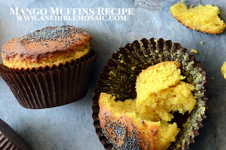 Como una variedad de sabores en una bebida india Lassi de mango, esta receta de muffin de mango tiene un sabor profundo a mango con un toque de vainilla y cardamomo y una miga suave y esponjosa.