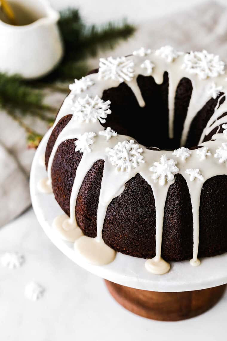 Espolvorea el glaseado sobre el pastel enfriado. Decora con copos de nieve y sirve.