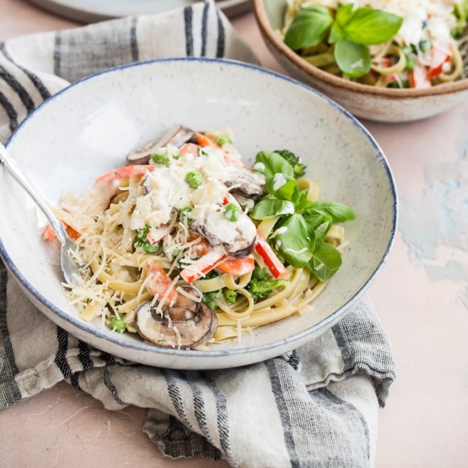 Si está tratando de averiguar qué receta de pasta cremosa hacer, Pasta Primavera ofrece más verduras, ¡eso es algo bueno!
