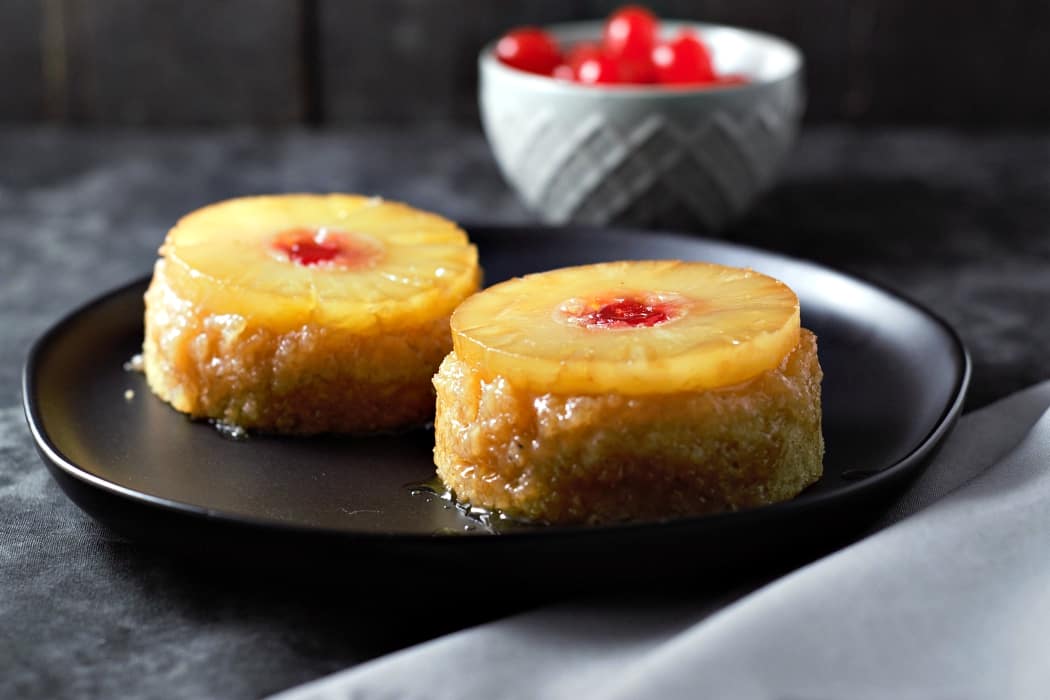 ¡Estos pasteles de piña invertidos individuales son increíbles! Los pasteles amarillos esponjosos están cubiertos con anillos de piña, cereza marrasquino y el glaseado dulce de azúcar moreno y mantequilla crean un sabor y una textura crujientes.
