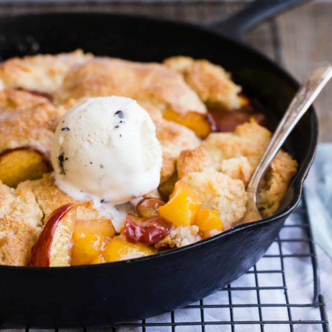 En lugar de una sartén, puede usar su horno holandés favorito o una sartén de hierro fundido para esta receta, pero puede extender la sartén antes de agregar los duraznos. También puede dividir este pastel en pequeñas porciones individuales y hornear usando moldes aptos para horno con mantequilla.