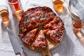 “Nuestra receta incluye cuatro ‘trucos’ de cocina. Un método no tradicional, casi amasable, de doblar la masa crea bolsas aireadas en la corteza. Un descanso frío durante la noche permite que la masa desarrolle el máximo sabor. Cocinar en una sartén de hierro fundido hace una corteza audiblemente crujiente para su sabrosa variedad de ingredientes. Y finalmente, las capas únicas del queso debajo de la salsa actúan como una barrera para minimizar la pegajosidad. ”