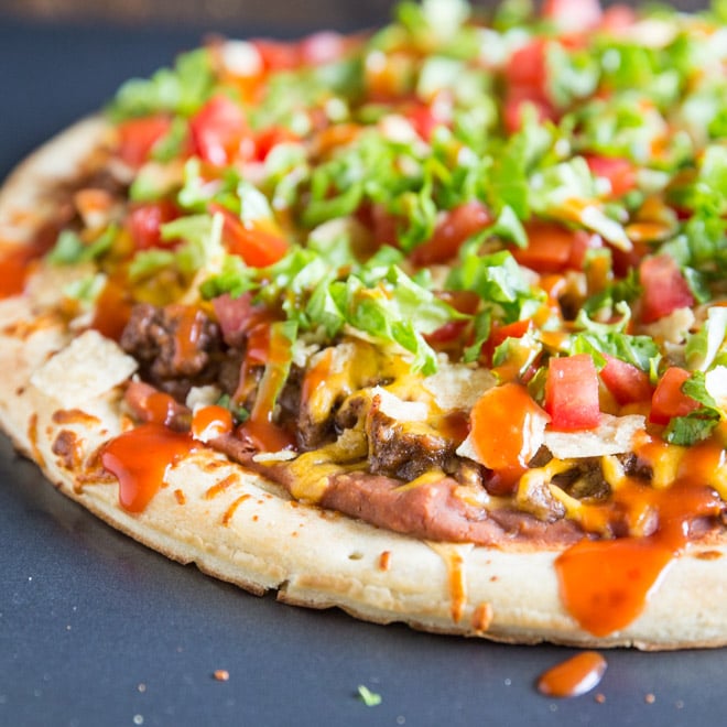 Una receta fácil para la pizza de taco. Comience con una corteza comprada en la tienda y agregue una mezcla de frijoles fritos con salsa, carne molida sazonada, queso y papas fritas crujientes. ¡Lleve a ebullición y agregue lechuga, tomate y su salsa para tacos favorita! Listo en 30 minutos o menos y tan delicioso.