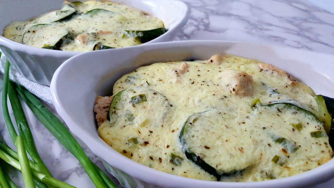 Chicken Zucchini Bake es una deliciosa mezcla de pollo cortado en cubitos y calabacín mezclado con queso italiano rallado, crema agria, cebolla verde y huevo cubierto con albahaca, sal y pimienta negra recién molida.