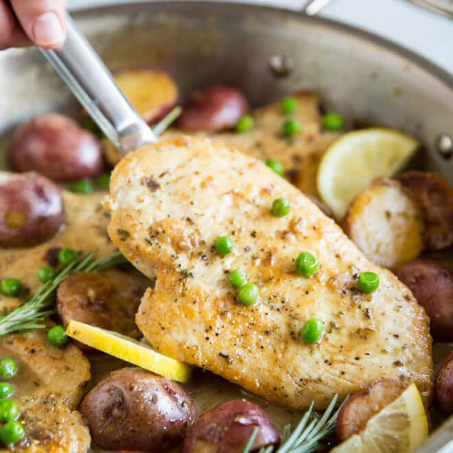 - Aumente el fuego a medio-alto y cocine la salsa hasta que baje a aproximadamente 1 taza, aproximadamente 5 minutos. Agregue los guisantes y cocine hasta que esté caliente, aproximadamente 1 minuto. Apaga el fuego y agrega la mantequilla y el jugo de limón y sazona con sal y pimienta al gusto. Vierta la salsa sobre el pollo y las papas y sirva.