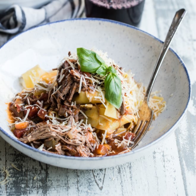 Una receta hermosa y sencilla del norte de Italia, este ragú de ternera cocido a fuego lento con pappardelle es cálido y tentador después de un largo día de trabajo. Carne, tomate, zanahoria, cebolla y un chorrito de vino tinto hervidos hasta casi derretirse en la pasta, no hay mejor manera de comerlo. Cocina: Italiana Tiempo de preparación: 10 minutos Tiempo de cocción: 20 minutos Cocción: lento 4 horas Tiempo total: 30 minutos Porciones: 6 porciones Calorías: 710kcal