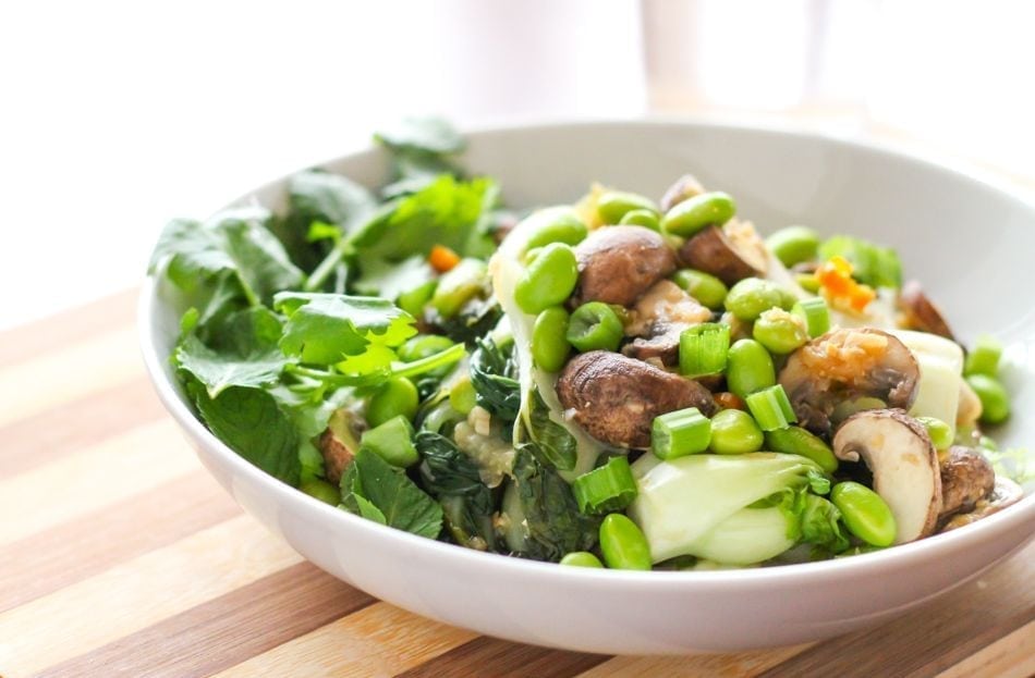 Mezcla la col china y el edamame con el resto de la mezcla de miso. Revuelva ocasionalmente durante 3-4 minutos, o hasta que el repollo chino esté marchito y de color verde brillante.