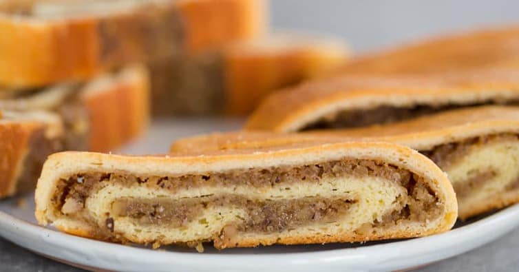 En una palabra, esta receta de rollo de nueces es espectacular. A menudo he tenido un rollo de nuez que es blando y seco y/o no tiene suficiente relleno. La masa para esta receta es muy, muy suave y el relleno es extremadamente húmedo. Además, la proporción de relleno a masa es muy alta, lo que evita que todo se seque y empaqueta una tonelada de sabor incluso en las rebanadas más pequeñas.
