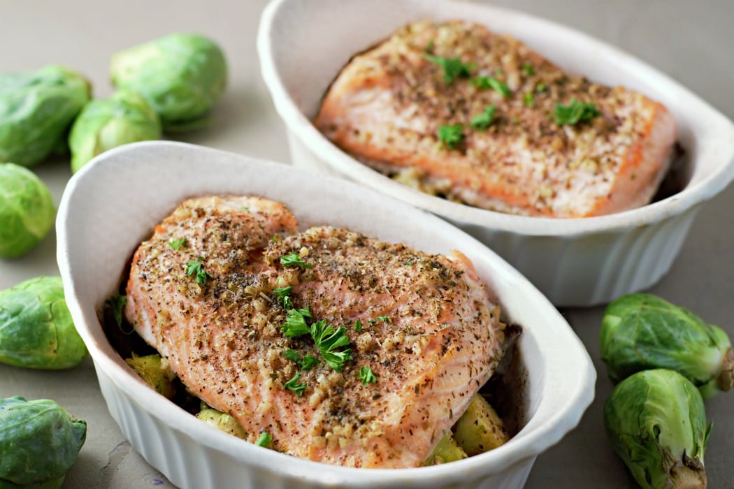 El salmón cocido, el ajo y las coles de Bruselas se hornean al horno con ajo, vino y orégano. Este plato es bajo en carbohidratos y sin gluten, listo en 35 minutos.