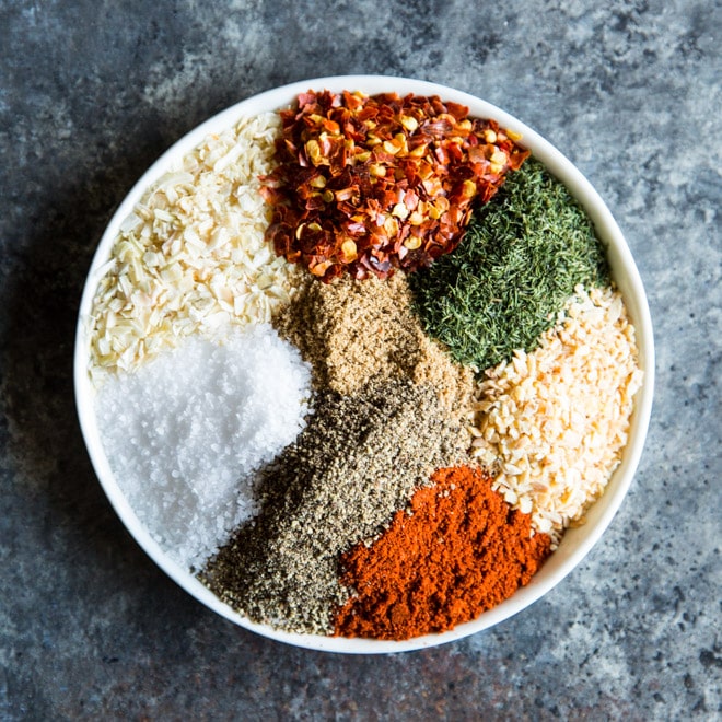 - En un tazón pequeño, combine el pimentón, la pimienta, la sal, el ajo, la cebolla, el cilantro, el eneldo y el pimiento rojo picado. Almacenar en un recipiente hermético.
