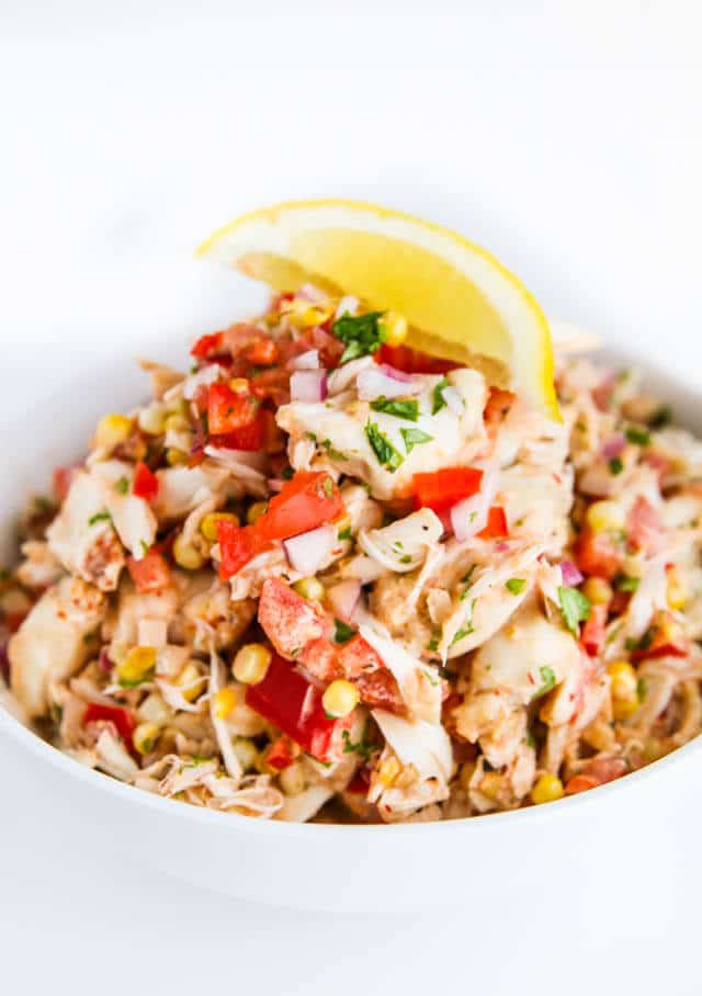 Maíz fresco, tomates, pimientos, cebollas rojas, cilantro y jugo de limón son los ingeniosos ingredientes que mantienen esta salsa de cangrejo ligera y saludable.