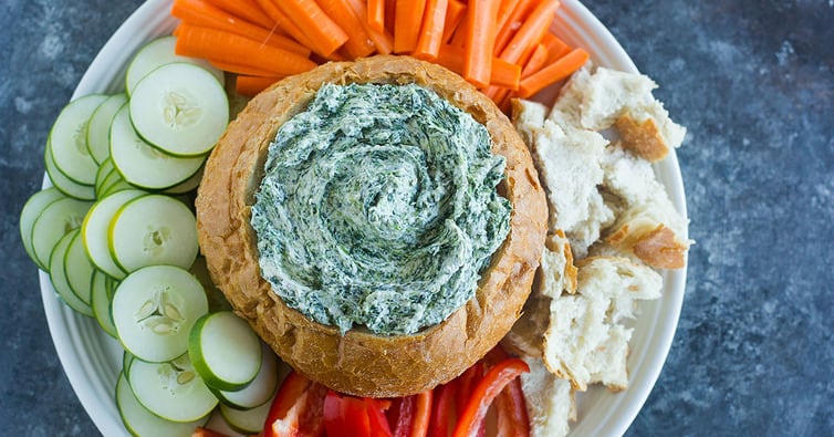 ¡ME ENCANTA servir esto en un tazón de pan! Solo lleva unos minutos vaciar una barra de pan redonda y cortarla en cubos (y siempre está el ooooh y el ahhhh). Si sigues esta ruta (¡y deberÃas hacerlo, es asà de fácil!), puedes servirlo con pan cortado en cubitos y una variedad de galletas saladas y vegetales.