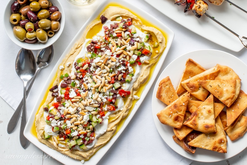 Esta hermosa salsa de hummus en capas es absolutamente perfecta para el entretenimiento informal. Se prepara fácilmente con alimentos precocinados comprados en la tienda, sin hornear (¡a menos que cuente los piñones tostados durante 5 minutos!) Esta salsa multiusos es un excelente comienzo para su cena con tema griego, pero también sirve como aperitivo adicional. . en el. Es fabuloso para untar en todo, desde pitas, papas fritas, verduras e incluso en su plato principal. Pollo a la parrilla Brochetas Nuestra salsa de hummus en capas es justo lo que necesita para mantener el pollo y las verduras en una pizza de pita griega o un sándwich Gyro.