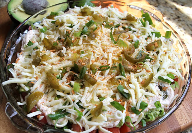 Seven Layer Dip complace a la multitud. Este bocadillo es un favorito de la fiesta.