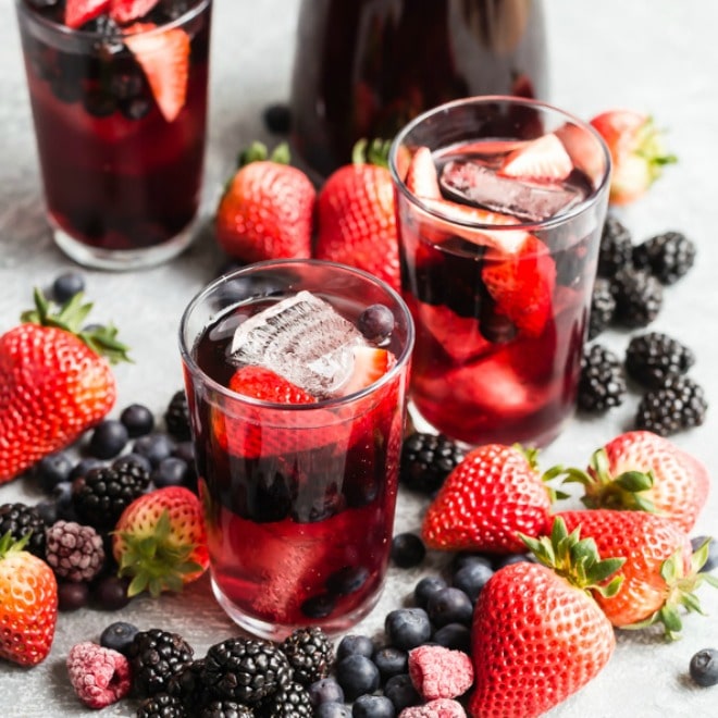 Mi receta es muy sencilla de hacer; Simplemente combine su té helado favorito, el vino tinto más dulce y el jugo de bayas y sirva sobre hielo adornado con bayas frescas.