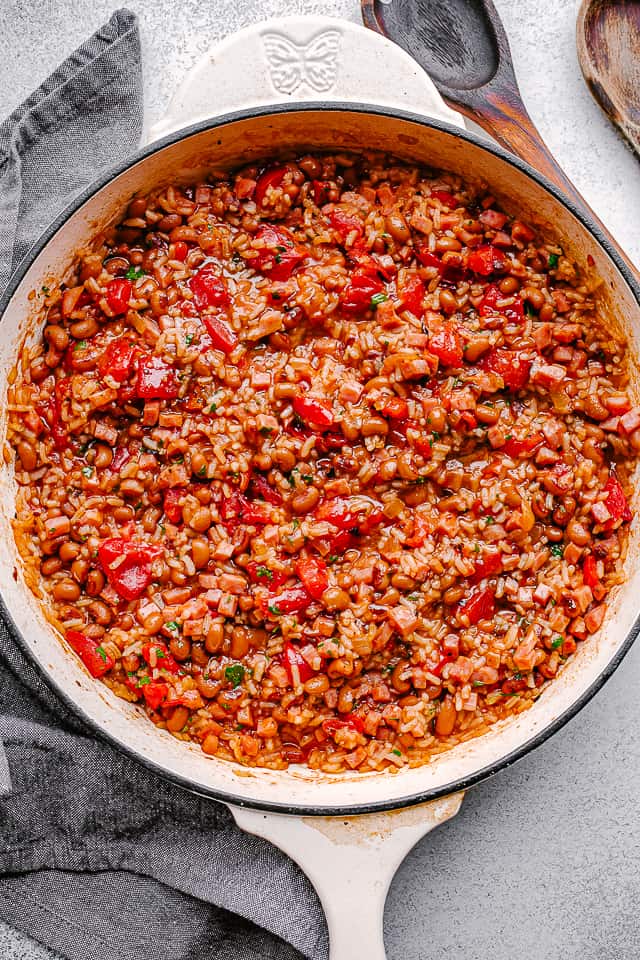 ES Receta de sartén Hoppin’ John ¡Es perfecto para traer buena suerte en el nuevo año! Un plato clásico del sur con frijoles caritas, jamón y arroz, se sirve tradicionalmente el día de Año Nuevo para tener buena suerte en el próximo año.