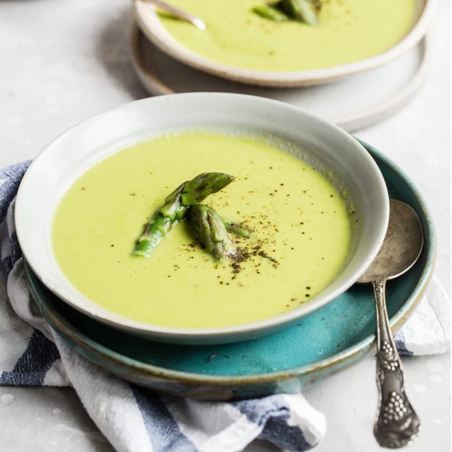 - Crema de Espárragos Vegana: Definitivamente puedes cambiar el caldo de pollo por caldo de verduras y usar leche de coco en lugar de crema, pero eso puede afectar el sabor de la sopa que conoces y amas. Por favor, hágame saber cómo va en los comentarios a continuación!